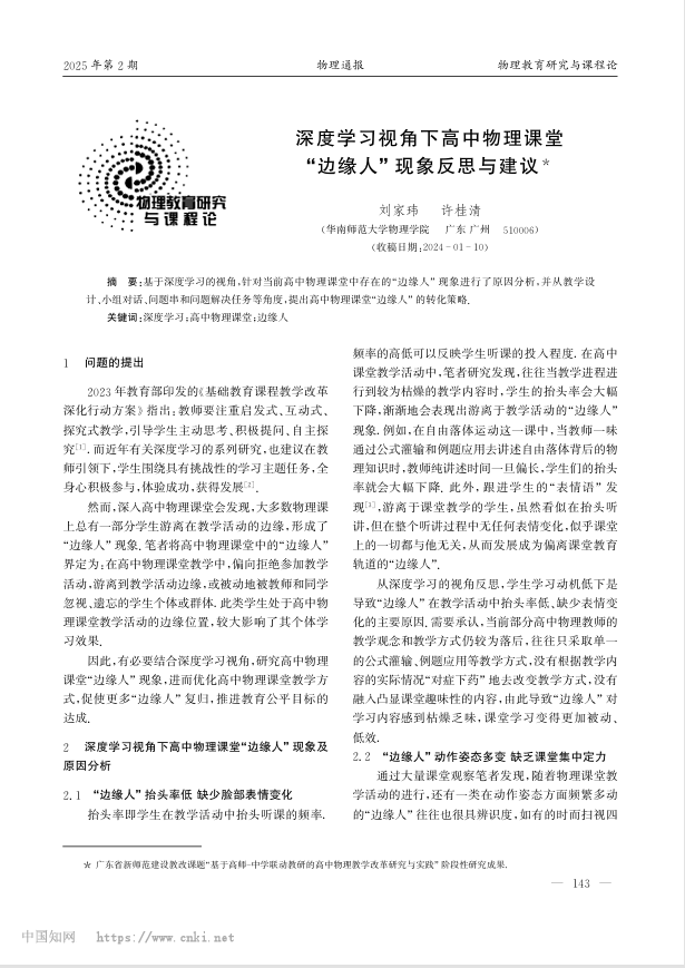 作者:刘家玮,许桂清来源刊物:物理通报摘要:基于深度学习的视角,针对当前高中物理课堂中存在的“边缘人”现象进行了原因分析,并从教学设计、小组对话、问题中和问题解决任务等角度,提出高中物理课堂“边缘人”的转化策略。关键词:深度学习;高中物理课堂;边缘人