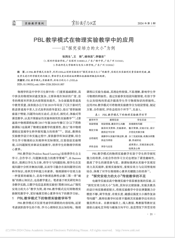 作者:张润生,王丽,杨诗琪,李德安来源刊物:实验教学与仪器摘要:以PBL教学模式为指导,利用DISLab创新实验进行“探究安培力大小”的教学,实现定性实验到定量实验的突破,激发学生进行科学探究的内驱力,帮助学生更加深刻地理解和把握物理概念和规律。关键词:PBL教学模式;实验教学;安培力的大小;DISLab