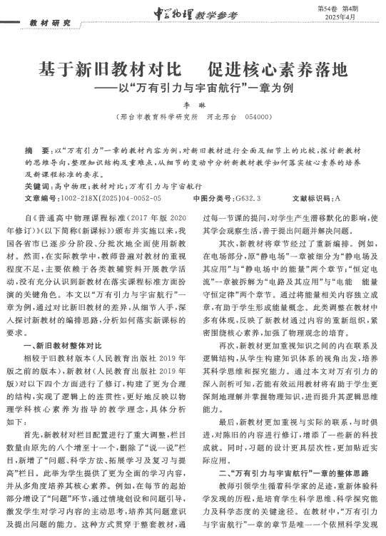作者:李琳来源刊物:中学物理教学参考摘要:以“万有引力”一章的教材内容为例,对新旧教材进行全面及细节上的比较,探讨新教材的思维导向,整理知识结构及重难点,从细节的变动中分析新教材教学如何落实核心素养的培养及新课程标准的要求。