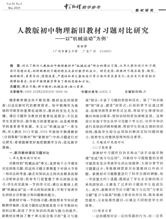 作者:张丽君来源刊物:中学物理教学参考摘要:对比了新旧人教版初中物理教材中“机械运动”部分的课后习题,从单元整体设计和习题设计思想出发,剖析新教材习题的特点及其对教学的启示。研究发现,新教材习题在数量、题型编排顺序、素养导向、情境设置、严谨性和单元整体设计等方面均有显著变化,这些变化紧密贴合新课标要求,为初中物理教学带来了新的思路和方向。