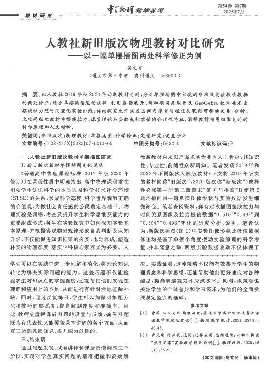 作者:吴文肖来源刊物:中学物理教学参考摘要:以人教社 2019年和 2020年两版教材为例,分析单摆插图中出现的形状及实验极值数据的两处修正,结合单摆简谐运动规律,利用泰勒展开、调和项误差取舍及 GeoGebra 软件确定出摆线拉力随时间变化实验曲线;详细探究允许误差区间内球重与极值关联间可替换关系,分析比较两版次教材中摆线拉力、球重理论与实验或标准值的合理性特征,阐释教材插图细微变迁的科学原理和人文精神。关键词:新旧版次;物理教材;单摆插图;科学修正;定量研究;误差分析