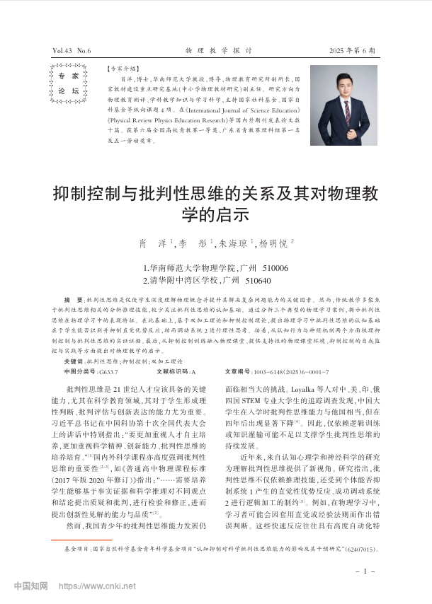 作者:肖洋,李彤,朱海琼,杨明悦来源刊物:物理教学探讨摘要:批判性思维是促使学生深度理解物理概念并提升其解决复杂问题能力的关键因素。然而,传统教学多聚焦于批判性思维相关的分析推理技能,较少关注批判性思维的认知基础。通过分析三个典型的物理学习案例,揭示批判性思维在物理学习中的表现特征。在此基础上,基于双加工理论和抑制控制理论,提出物理学习中批判性思维的认知基础在于学生能否识别并抑制直觉优势反应,从而调动系统2进行理性思考。关键词:批判性思维;抑制控制;双加工理论