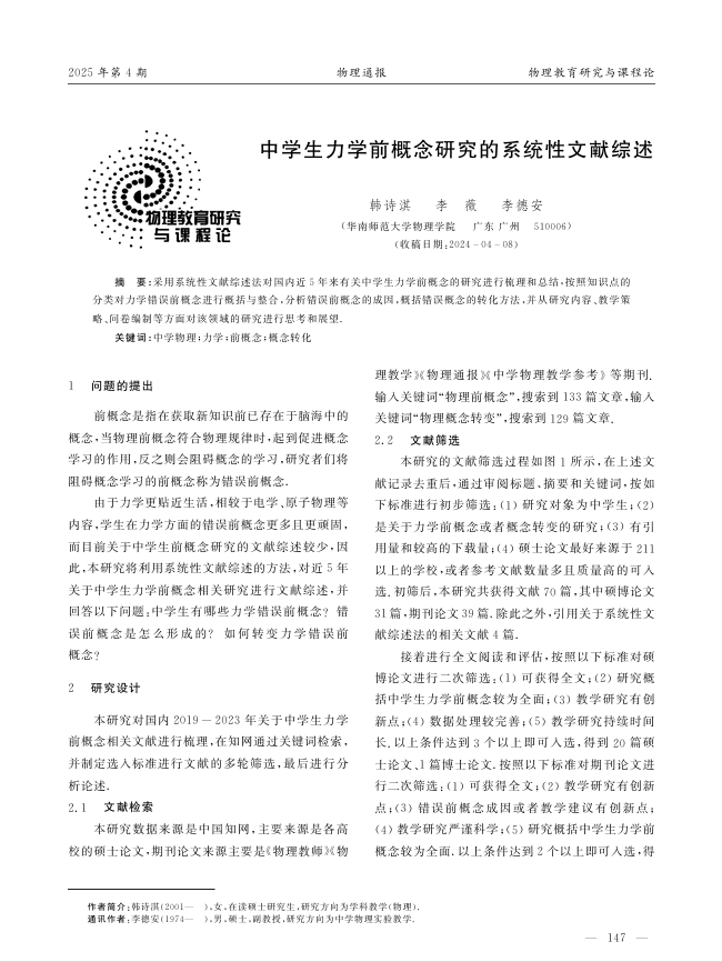 作者:韩诗洪;李薇;李德安来源刊物:物理通报摘要:本研究利用系统性文献综述的方法,对近5年关于中学生力学前概念相关研究进行文献综述,回答中学生有哪些力学错误前概念、错误前概念的形成原因以及如何转变力学错误前概念等问题。关键词:前概念;力学;概念转变;系统性文献综述;