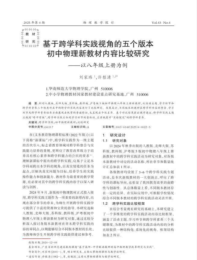 作者:刘家玮;许桂清来源刊物:物理教学探讨摘要:针对人教版、北师大版、苏科版、教辅版、沪粤版5版初中物理八年级上册新教材,从活动主题、学习环节和跨学科素养三个维度对其中的跨学科实践内容进行了比较研究,提出跨学科实践主题应做到“跨中有联”,体现学习环节的整体性。关键词:跨学科实践;初中物理新教材;比较研究;