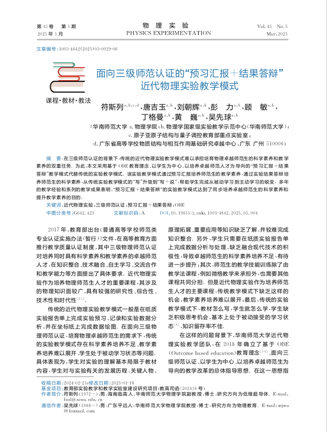 作者:符斯列;唐吉玉;刘朝辉;彭力;顾敏;丁格曼;黄巍;吴先球来源刊物:物理实验摘要:在三级师范认证背景下,采用基于OBE教育理念的“预习汇报+结果答辩”教学模式代替传统实验教学模式,通过预习汇报培养师范生的教学素养,通过实验结果答辩培养科学素养。关键词:近代物理实验;三级师范认证;预习汇报+结果答辩;OBE;