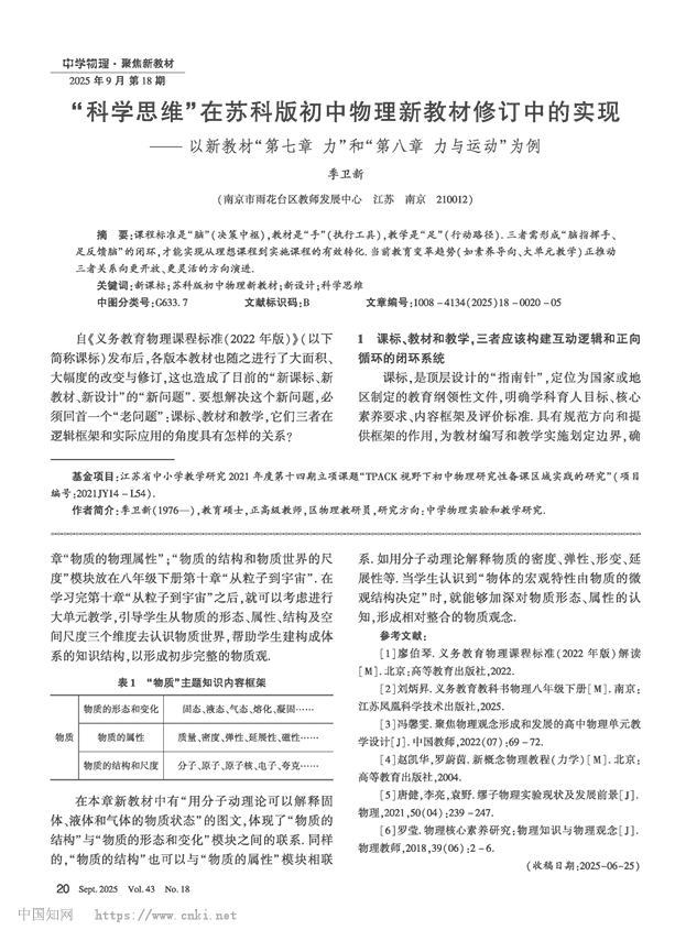 关键词:新课标;苏科版初中物理新教材;新设计;科学思维