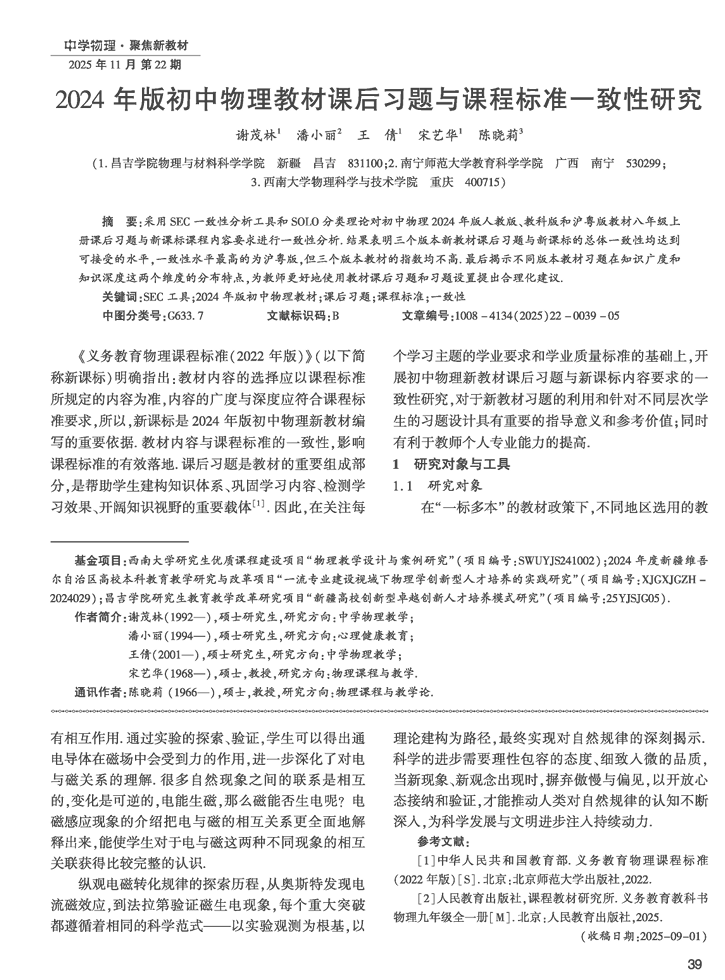 摘要:采用SEC一致性分析工具和 SOLO 分类理论对初中物理 2024年版人教版、教科版和沪粤版教材八年级上册课后习题与新课标课程内容要求进行一致性分析,结果表明三个版本新教材课后习题与新课标的总体一致性均达到可接受的水平,一致性水平最高的为沪粤版,但三个版本教材的指数均不高.最后揭示不同版本教材习题在知识广度和知识深度这两个维度的分布特点,为教师更好地使用教材课后习题和习题设置提出合理化建议。