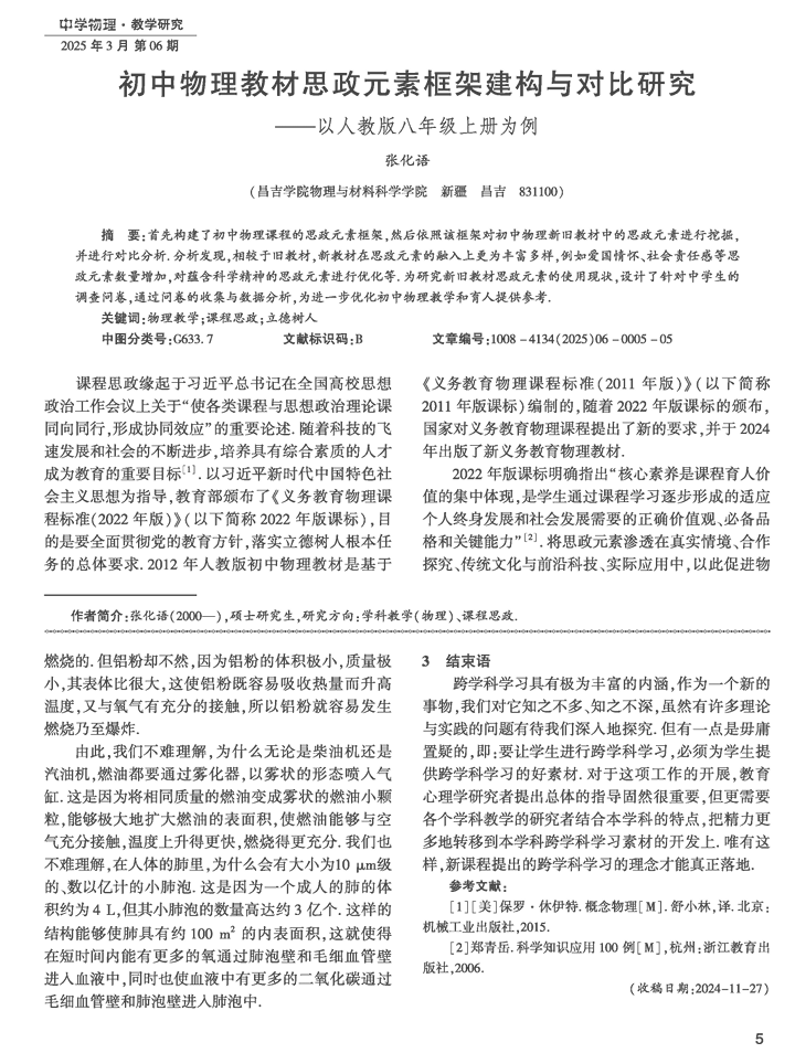 摘要:首先构建了初中物理课程的思政元素框架,然后依照该框架对初中物理新旧教材中的思政元素进行挖掘,并进行对比分析,分析发现,相较于旧教材,新教材在思政元素的融入上更为丰富多样,例如爱国情怀、社会责任感等思政元素数量增加,对蕴含科学精神的思政元素进行优化等,为研究新旧教材思政元素的使用现状,设计了针对中学生的调查问卷,通过问卷的收集与数据分析,为进一步优化初中物理教学和育人提供参考。