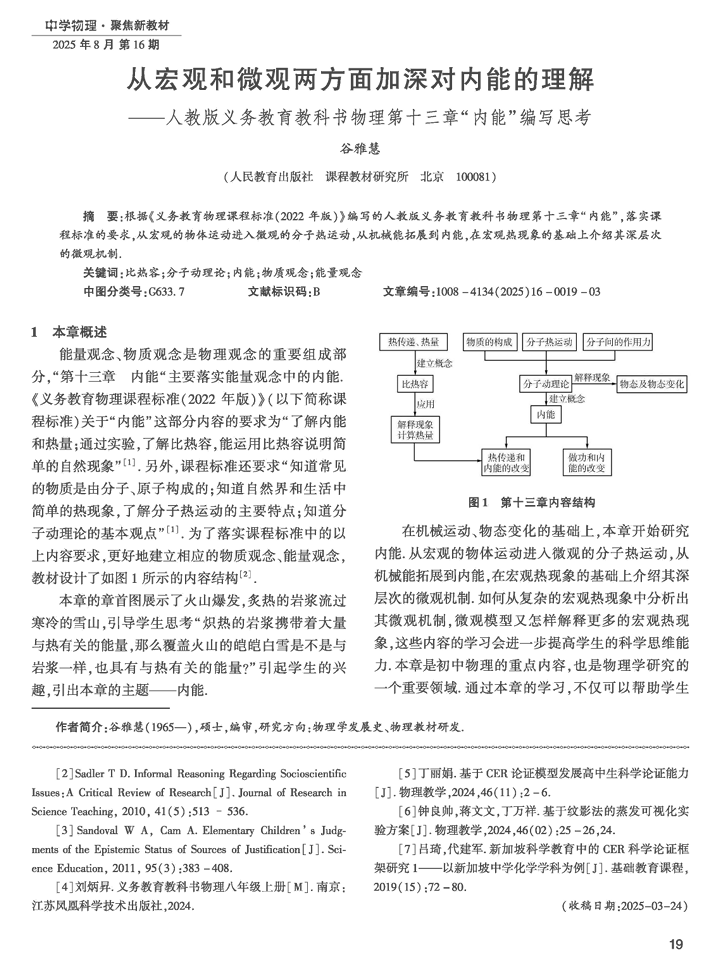 摘要:根据《义务教育物理课程标准(2022 年版)》编写的人教版义务教育教科书物理第十三章“内能”,落实课程标准的要求,从宏观的物体运动进入微观的分子热运动,从机械能拓展到内能,在宏观热现象的基础上介绍其深层次的微观机制。