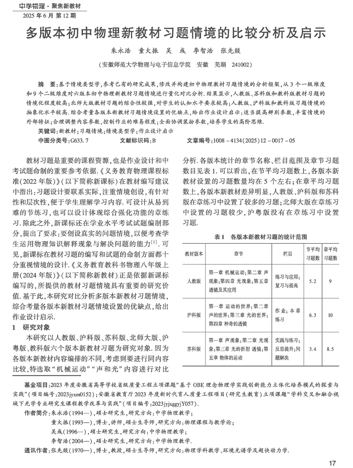 摘要:基于情境类型学,参考已有的研究成果,修改并构建初中物理教材习题情境的分析框架,从3个一级维度和9个二级维度对六版本初中物理新教材习题情境进行量化对比分析,结果显示,人教版、苏科版和教科版教材习题的情境化程度较高:北师大版教材习题的综合性较强,对学生的认知水平要求较高:人教版、沪科版和教科版习题情境的抽象化水平较高,综合考量各版本新教材习题情境设置的优缺点,给出作业设计启示:适当提高辨别参数,丰富情境的外部特征;合理调整内容参数,控制作业的难易程度;全面协调装扮参数,培养学生的高阶思维。