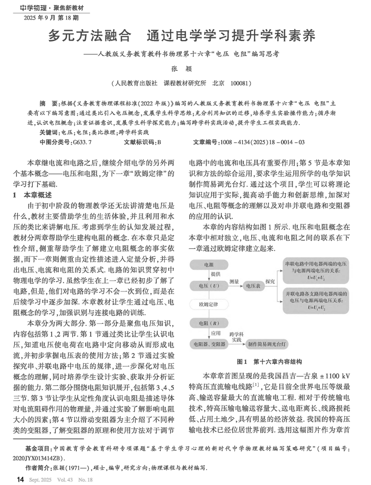 摘要:根据《义务教育物理课程标准(2022 年版)》编写的人教版义务教育教科书物理第十六章“电压 电阻”主要有以下编写意图:通过类比引入电压概念,发展学生科学思维:充分利用知识的迁移,培养学生实验操作能力:循序渐进,认识电阻概念;注重证据意识,发展学生科学探究能力;编写跨学科实践活动,提升学生工程实践能力。