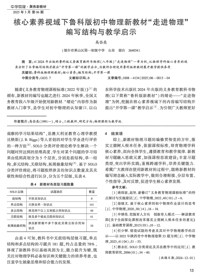 摘要:以2024年出版的鲁科版义务教育教科书物理(八年级)“走进物理”一章为例,从物理学科核心素养的视角分析了本章编写结构并提出“开学第一课”的教学启示,为教师合理使用鲁科版新教材展开教学提供参考。