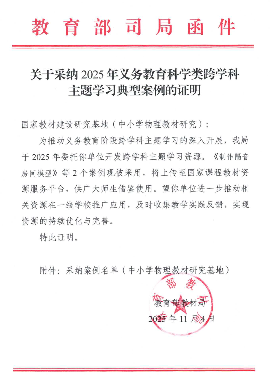 为推动义务教育阶段跨学科主题学习的深入开展,教育部教材局于2025年委托基地开发相关主题学习资源。国家教材建设重点研究基地(中小学物理教材研究)经过广泛征集、层层遴选与专业指导,精心打磨了《制作隔音房间模型》《制作生态桥模型》2个案例,分别包含学生手册、教师手册、整体教学设计和分课时教学设计、任务单、案例说明和教学PPT等资源。经多轮优化完善,案例最终通过评审,被正式采纳为示范性教学资源,将上传至国家课程教材资源服务平台,供全国师生借鉴使用。